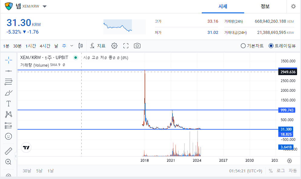넴은 현재 2024년 06월 06일 오전 01시 기준 대략 31원 사이에 거래가 되고 있습니다.
