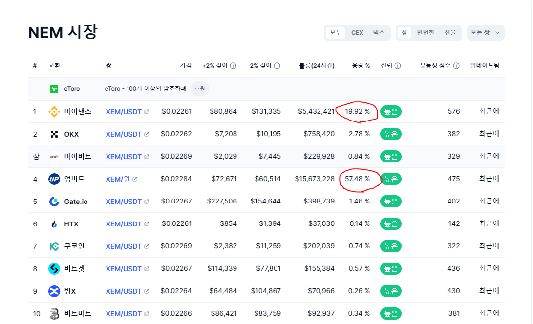 하지만 1위 거래소인 바이낸스에서도 평소 거래되던 넴의 거래량 및 보유량이 10% ~ 20% 안팎 밖에 되지 않습니다.