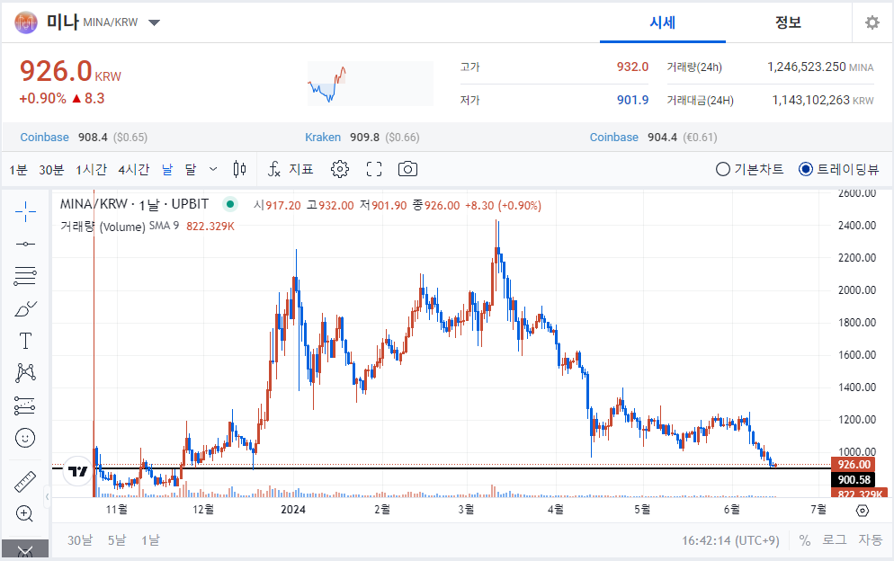 업비트에서 오는 시간 2024/06/16 오후 16시 경 미나코인 시세 입니다.(926원)