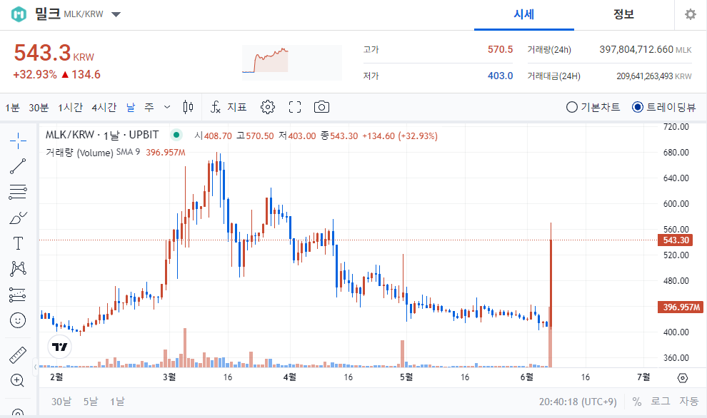 업비트에서 오는 시간 2024 / 06 / 07 오후 20시 경 밀크의 시세 입니다.