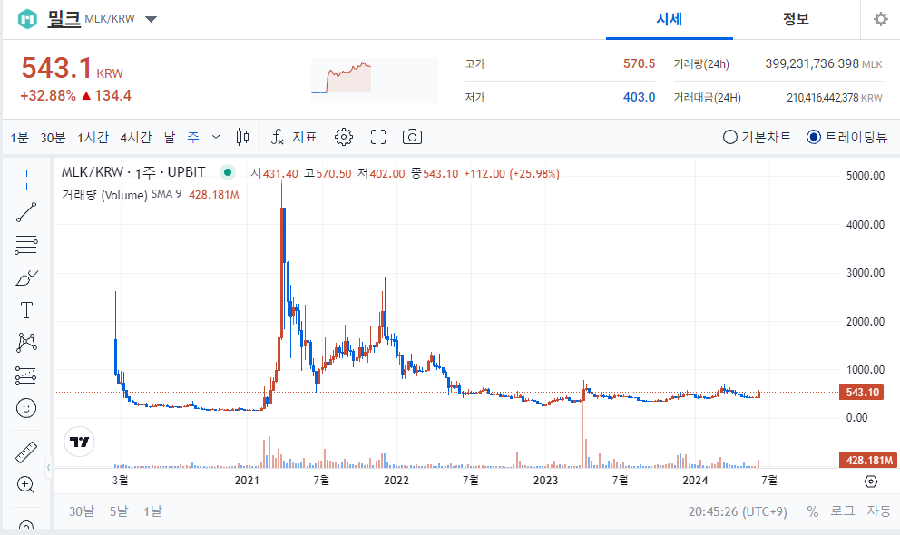 밀크는 21년도에 최고점 5,000원 까지 갔었던 코인입니다.