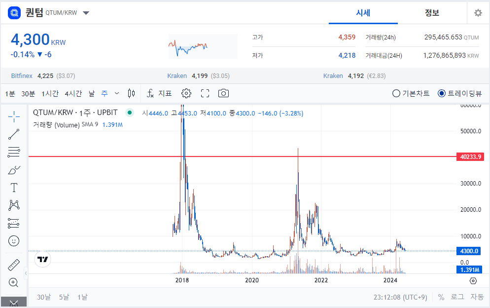 업비트에서 오는 시간 2024/06/13 오후 23시경 퀀텀코인 시세 입니다. (4300원)