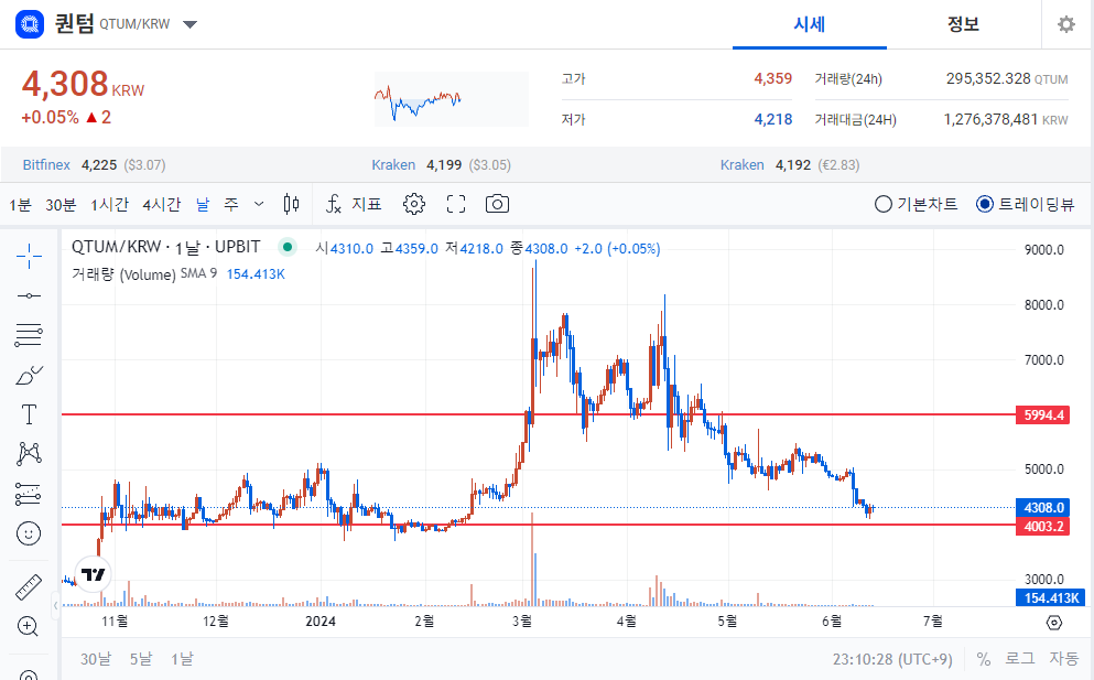 업비트에서 오는 시간 2024/06/13 오후 23시경 퀀텀코인 시세 입니다. (4300원)
